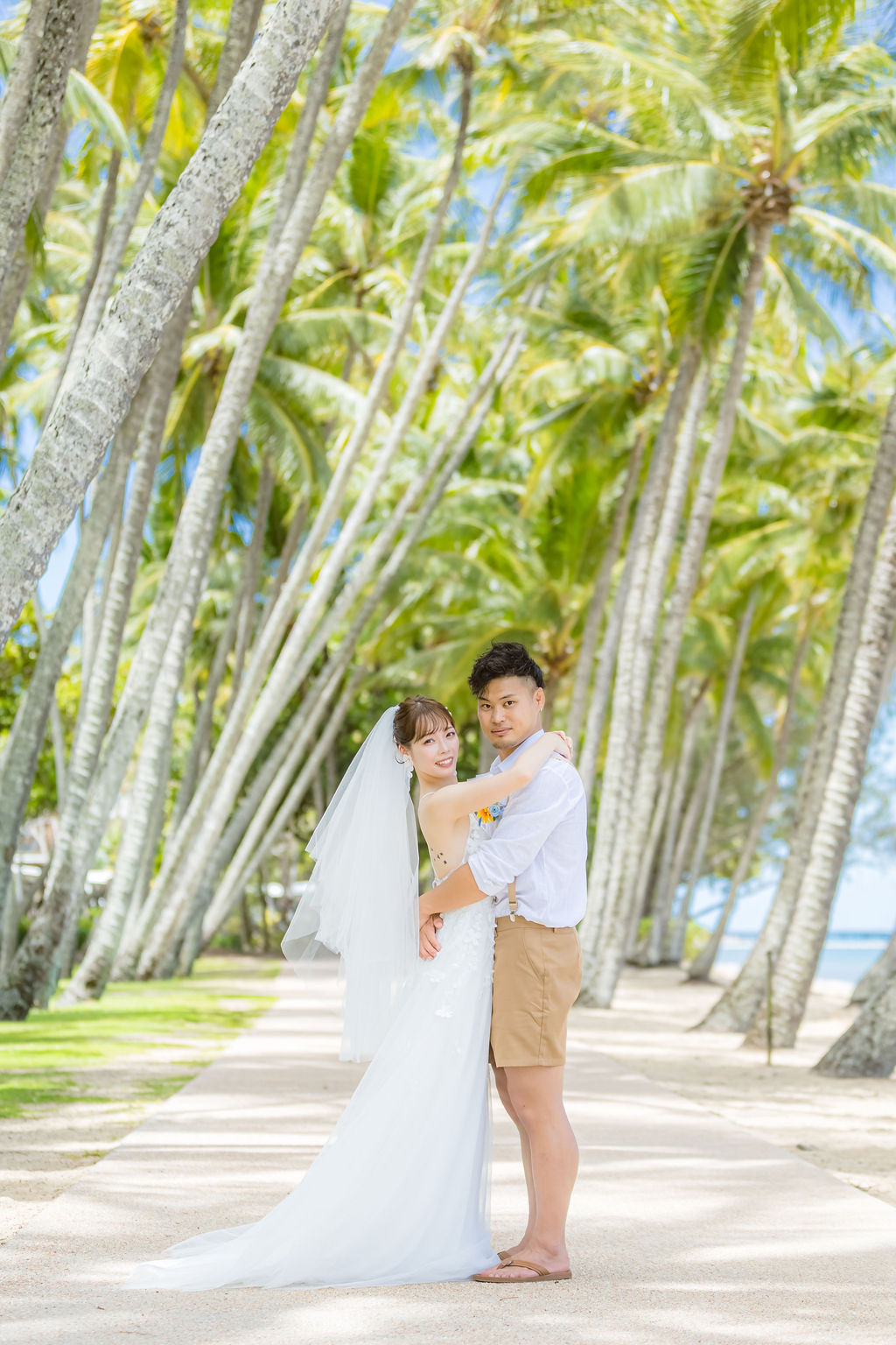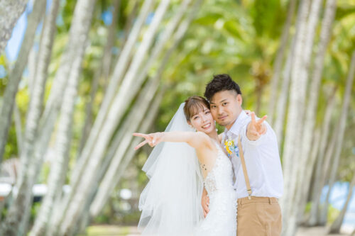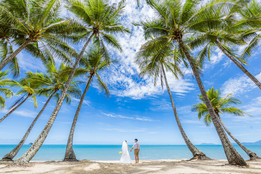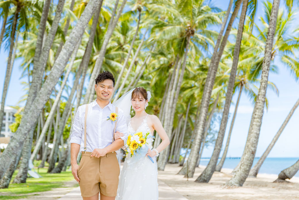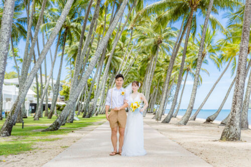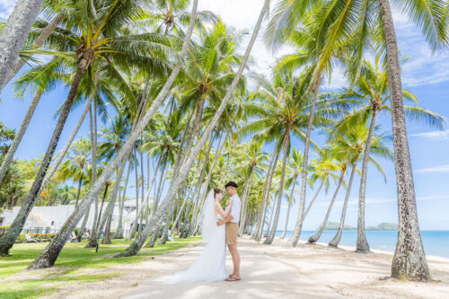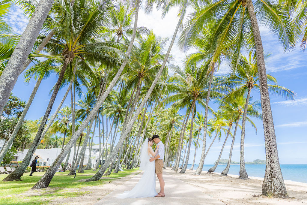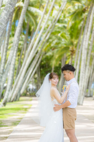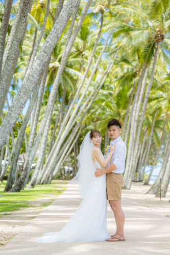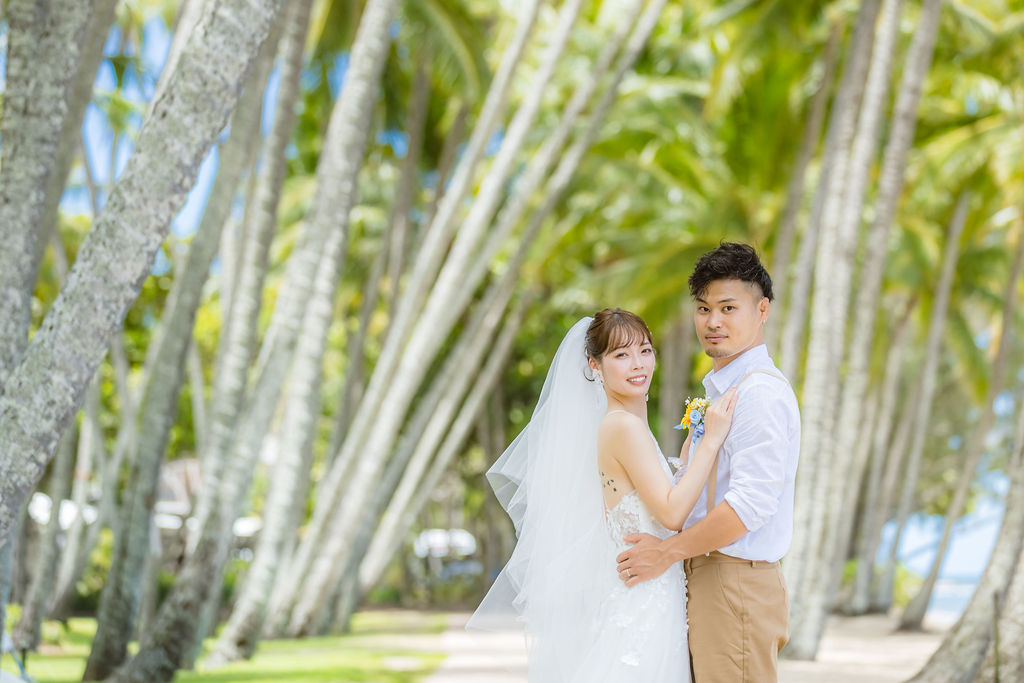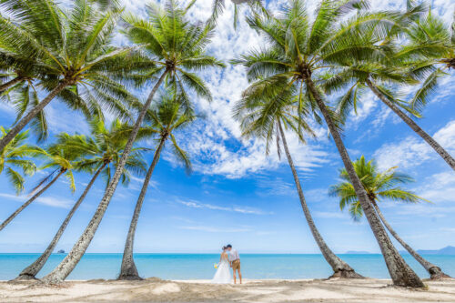広がるヤシの木並木と青い海、白い砂浜が魅力のロマンティックなロケーションです。